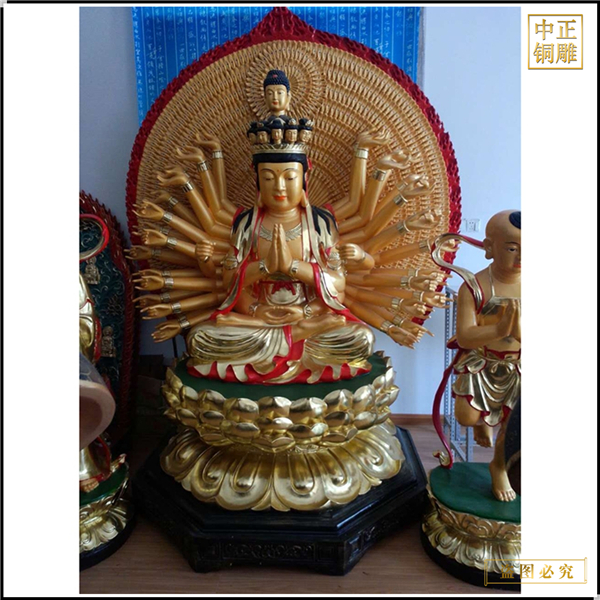 中正銅雕-千手觀音菩薩佛像廠、千手觀音菩薩佛像廠定制、千手觀音菩薩佛像廠報價,我公司集科研、開發設計、普通鑄造、一次性整體澆鑄、精密鑄造于一體。本公司技術力量雄厚,設備,不但重視中國青銅器原有的藝術風格,還繼承了文物原有的藝術品味,在繼承和發揚古老文化的同時,更深一步為新老客戶定身量制各種銅制、鐵制工藝品等產品,曾多次受到寺廟長老和美術學院教授的好評。