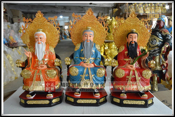 三清銅像分別是玉清元始天尊、上清靈寶天尊、太清道德天尊,總稱為“虛無自然大羅三清三境三寶天尊”,是道教神像的最高神,在道家文化中,這三清尊神開天辟地,傳道授法,乃當之無愧的道教最高神。