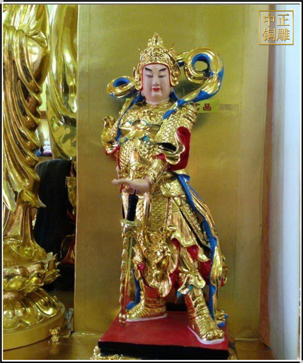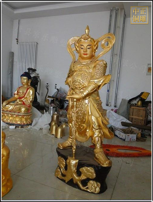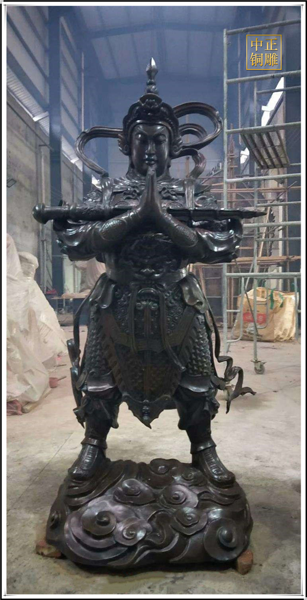 于是,韋陀被人們稱為護(hù)法菩薩。在中國(guó)的寺院殿宇里原印度血統(tǒng)的銅雕佛像韋陀已經(jīng)漢化了,成了一名地道的中國(guó)武將,英俊威武。他身披鎧甲,手持金剛杵,降魔去妖,威風(fēng)凜凜。天王殿中所塑的韋陀,一般具有兩種站立的姿態(tài),一個(gè)是雙手合十,橫杵于腕上,直挺而立;一個(gè)是一手握杵拄地,另一手叉腰。