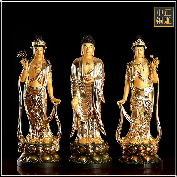 西方三圣又稱阿彌陀三尊,中間是阿彌陀佛,左邊大勢至菩薩,右邊為觀世音菩薩組成。西方三圣乃是凈土宗專修對象。 中正銅雕-西方三圣擺件、西方三圣擺件價格、西方三圣擺件廠家,我廠是一家專業生產人物雕塑的廠家,其質量和品質都非??煽?,有需要的客戶歡迎前來訂購。